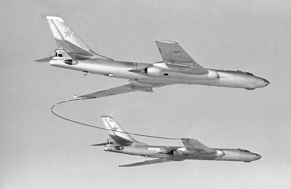 Северный флот. Дальние бомбардировщики "Ту-16" во время дозаправки в стратосфере. Фото: ТАСС/ Семена Майстермана 7/19Северный флот. Дальние бомбардировщики "Ту-16" во время дозаправки в стратосфере. Фото: ТАСС/ Семена Майстермана
