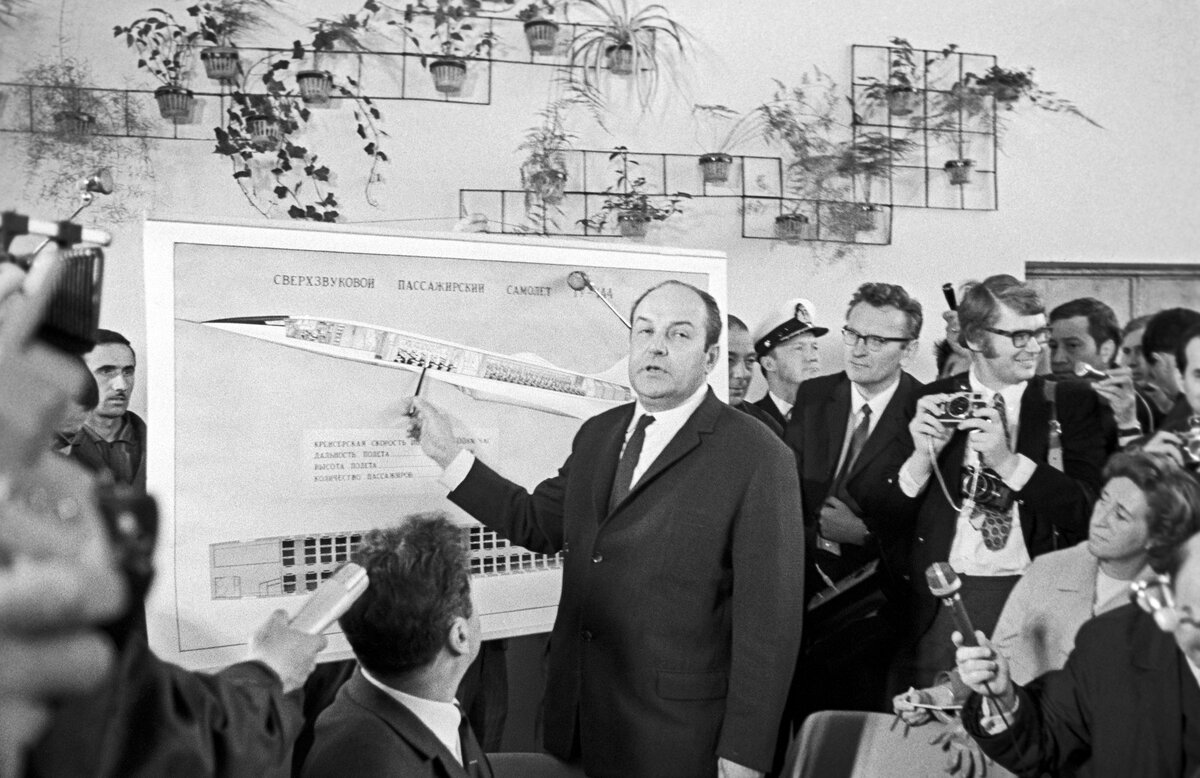 Генеральный конструктор Алексей Туполев (в центре) знакомит журналистов с новым сверхзвуковым пассажирским самолетом Ту-144. Фото: ТАСС/Сергей Преображенский 6/19Генеральный конструктор Алексей Туполев (в центре) знакомит журналистов с новым сверхзвуковым пассажирским самолетом Ту-144. Фото: ТАСС/Сергей Преображенский