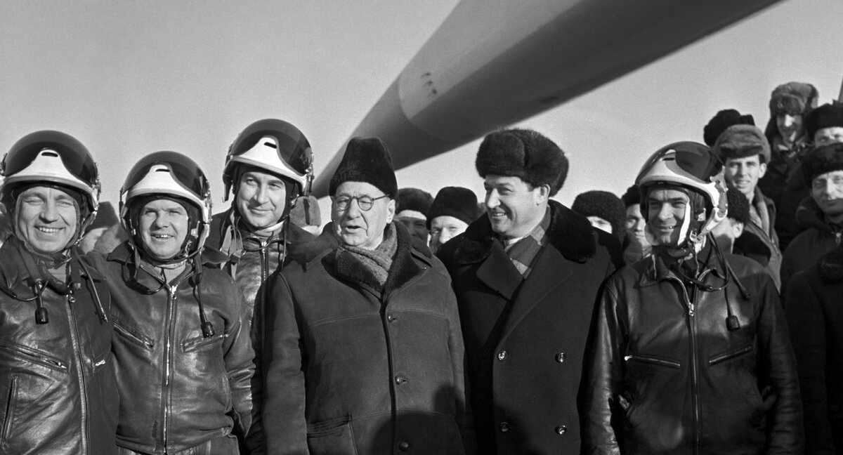 Слева направо: главный конструктор Алексей Туполев, ведущий инженер Владимир Бендеров, бортинженер Юрий Селиверстов, командир корабля Эдуард Елян и второй пилот Михаил Козлов в салоне сверхзвукового пассажирского авиалайнера Ту-144 перед первым полетом. Фото: ТАСС/ Ю.Чуприков 4/19Слева направо: главный конструктор Алексей Туполев, ведущий инженер Владимир Бендеров, бортинженер Юрий Селиверстов, командир корабля Эдуард Елян и второй пилот Михаил Козлов в салоне сверхзвукового пассажирского авиалайнера Ту-144 перед первым полетом. Фото: ТАСС/ Ю.Чуприков