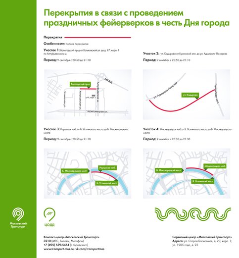 С 20:50 до 21:10 нельзя будет проехать по участку Вологодского проезда от улицы Хотьковская до дома 97, корпус 1 по Алтуфьевскому шоссе, на участке улицы Кадырова от Бунинской аллеи до улицы Адмирала Лазарева и на участке Раушской набережной от Большого Устьинского моста до Большого Москворецкого моста.