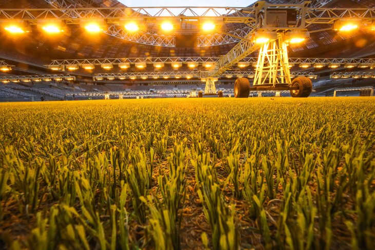 Газон засеяли еще в августе 2016 года – семена подбирались так, чтобы трава максимально подходила к столичному климату. Спустя месяц, когда она взошла и выросла до 3 сантиметров, газон прошили специальными синтетическими нитями – они обеспечивают поддержку корневой системы.