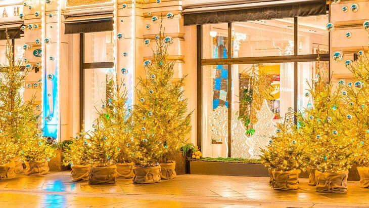 В прошлом сезоне самыми популярными цветами в украшении стали красный и золотой. В этом году заведения, которые уже преобразили свои фасады, отдают предпочтение гирляндам теплых и холодных оттенков.