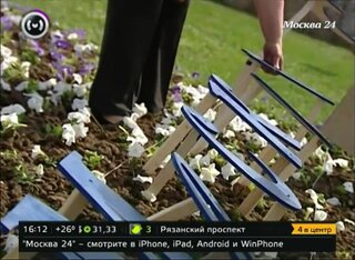 В Зеленограде около Дворца культуры появилась большая клумба с логотипом телеканала "Москва 24". Территорию украшают петуньи корпоративных цветов.