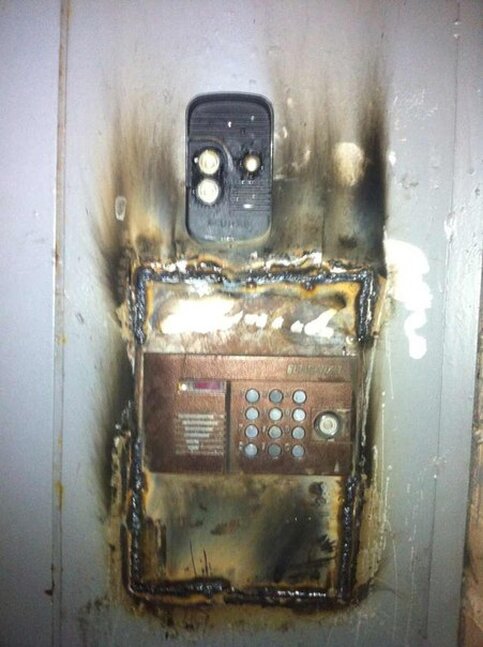 На фото можно увидеть, что старый домофон был вырезан из двери и был заменен на новый.