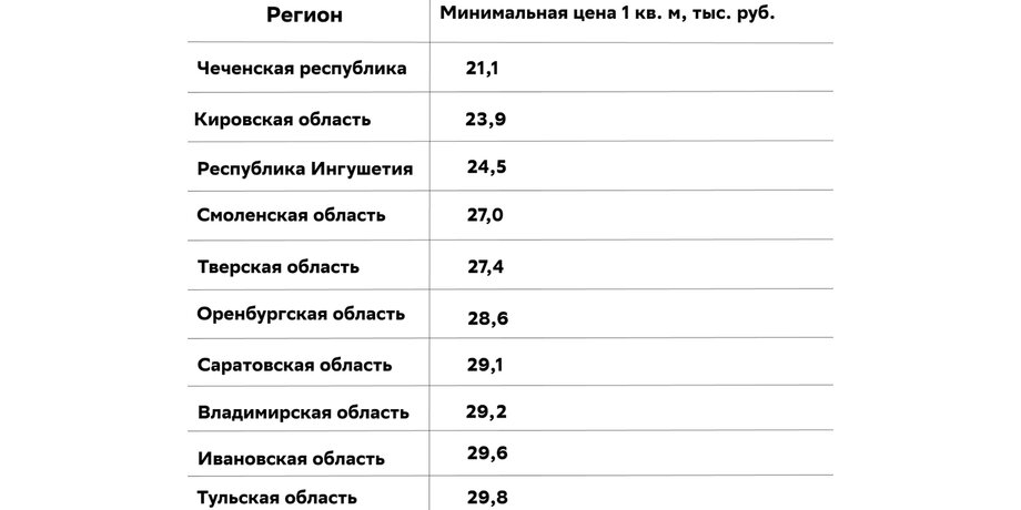 Также в число регионов с самыми дешевыми квартирами вошли Смоленская и Тверская области. Там стоимость квадратного метра жилья начинается от 27 и 27,4 тысячи соответственно.