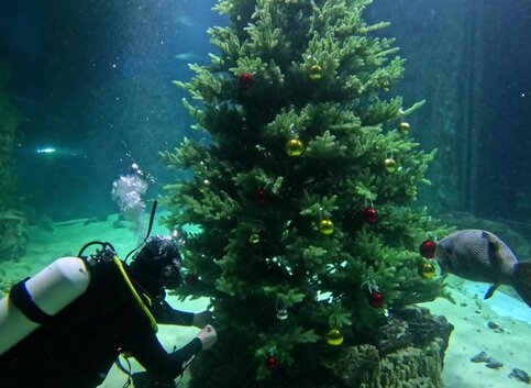 На кадрах видно, как аквалангист украшает уже установленную в аквариуме елку новогодними игрушками.