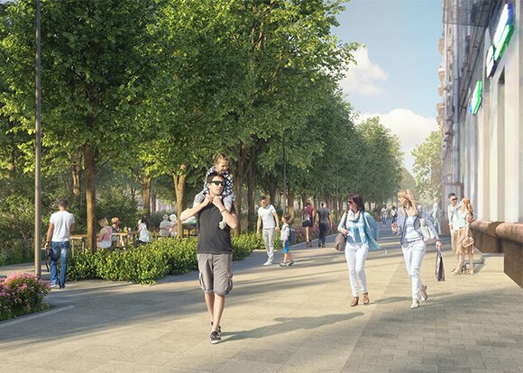 Также планируется объединить разрозненные части улицы, создать удобные транспортно-пешеходные связи и новые рекреационные зоны. Между проезжей частью и пешеходной зоной высадят кустарники, чтобы создать необходимый шумо- и пылезащитный барьер.