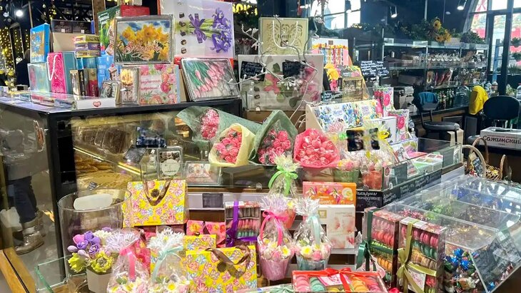 На ярмарке на Профсоюзной улице продаются наборы с тюльпанами из молочного шоколада, натуральным мармеладом, макарунами и различными конфетами. Там же, на прилавке фермеров из Самарской области, можно найти набор сыров.