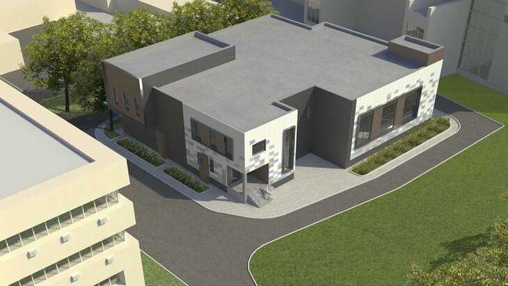 Территорию вокруг будущего корпуса благоустроят: организуют пешеходные дорожки, места для отдыха и новые зеленые посадки. Также на участке появится парковка.