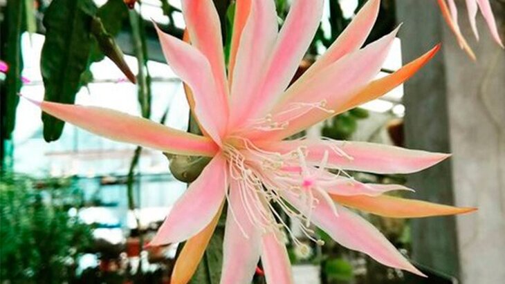 Необычное растение светло-розового оттенка с крупными коралловыми цветками представлено в Ботаническом саду на фестивале "Тропическая зима". Кактус-орхидея имеет второе название – эпикактус.