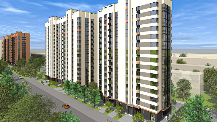Два жилых корпуса возведут по индивидуальному проекту. Фасады облицуют бетонной плиткой жемчужно-белого цвета, а акцентными оттенками выступят светло-серые и ярко-оранжевые вставки.