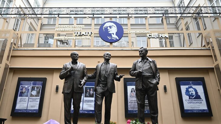 В Москве торжественно открыли памятник народным артистам Советского Союза Василию Лановому, Владимиру Этушу и Юрию Яковлеву. Мероприятие состоялось у Симоновской сцены Государственного академического театра имени Вахтангова.