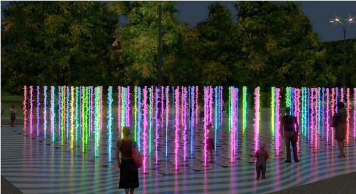Из нее будут бить 144 водяные струи высотой 2,5 метра. Световой эффект удастся создать благодаря сотне встроенных в основание фонтана лампочек. Каждые 10 секунд они будут менять свой оттенок – от холодного белого до яркого неонового.