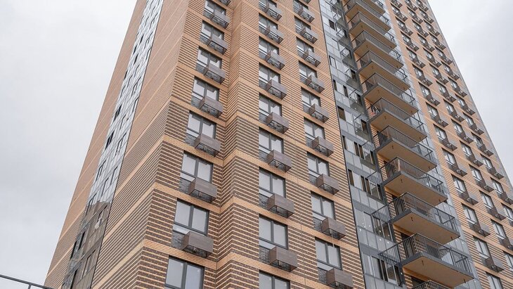 Фасады здания облицованы бежевым пиленым кирпичом, а входные группы, оконные рамы и корзины для кондиционеров – темно-коричневым. Придомовую территорию благоустроили. Там появились две детские и две спортивные площадки, а также зоны отдыха.