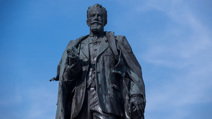 В комплексе напомнили, что бронзовый памятник ученому, созданный скульптором Салаватом Щербаковым, установили в 2008 году. Постамент украшен рельефным изображением радиобашни на Шаболовке, ГУМа, Киевского вокзала и других объектов, созданных по проектам Шухова.