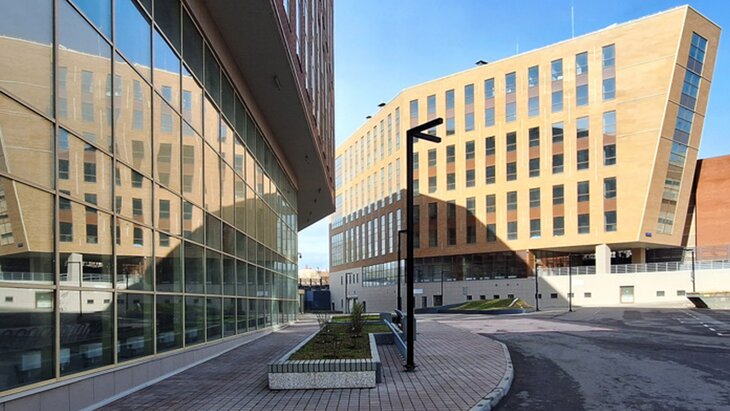 Он добавил, что окна образуют вертикальные стежки по всей длине фасадов. Также в бизнес-центре установили лестничные полотна и 10 лифтов – четыре в первом корпусе и шесть – во втором. На подземных этажах оборудована автостоянка на 136 машин, еще 40 парковочных мест разместили вокруг зданий.