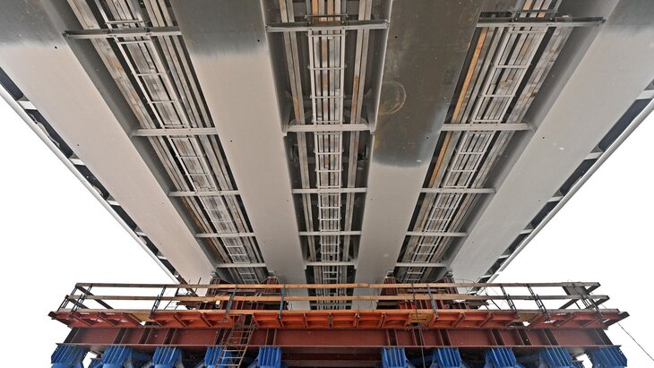 "Учитывая значительную протяженность – 291 метр, – пролетное строение опускалось поэтапно с использованием домкратов и подъемных механизмов. Это обеспечило его устойчивое положение и равномерное распределение нагрузки", – объяснил глава столичного Стройкомплекса.