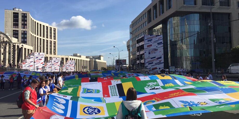 Участники акции развернули полотно из 2 тысяч флагов российских городов и общественных организаций. На получившемся полотне читается слово "Россия", сложенное из цветов триколора.