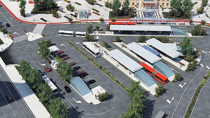 На площади вокзала установили пять остановок, обустроены новые пешеходные переходы, расширено пешеходное пространство.