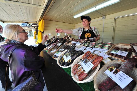 Посетителей также ждет широкий выбор сыров: тильзитер из Калининградской области, мягкий сыр качотта из Карелии, твердые сыры с пажитником и тмином из Саратова и необычный "Норвежский сыр" без сахара из Подмосковья.