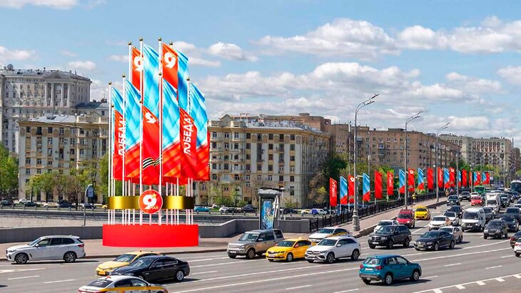 Десятки красно-голубых флагов появятся на Поклонной горе и Триумфальной площади, в парке Победы – декоративные яблони с георгиевскими лентами. Кроме того, в парке "Зарядье", на Пушкинской площади и в Новопушкинском сквере возведут мультимедийные конструкции, на которых будут транслировать поздравительные открытки.