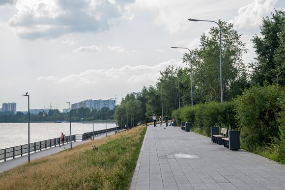 В настоящий момент специалисты подготовили деревянную террасу у воды. В ближайшее время там установят оборудованные навесами шезлонги. А вдоль Москвы-реки установят перила. С террасы откроется вид на Москворецкую пойму.