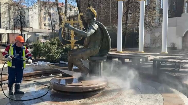 Бригада коммунальщиков использовала поливомоечную машину и аппараты высокого давления. На поверхность фонтанов нанесли специальное моющее средство, затем смыли водой. Особое внимание уделили скульптурам, колоннаде, парапетам и чашам.