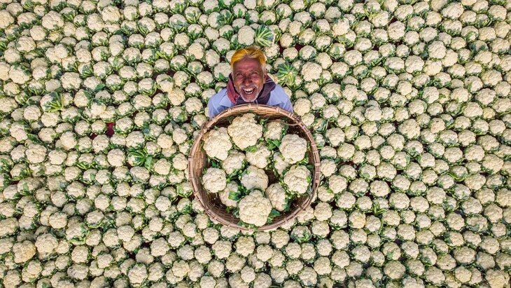 На фотографии изображен крестьянин, показывающий урожай цветной капусты. За снимок проголосовали порядка четверти пользователей.