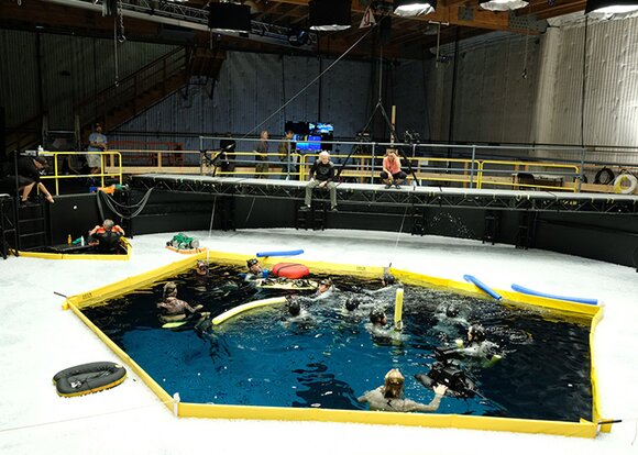 На снимках видно, как актеры погружены в воду, а режиссер руководит съемочным процессом со специального надстроенного помоста. Зона съемки окружена слоем мелких пенопластовых шариков, чтобы ограничить попадание света в подводных сценах.