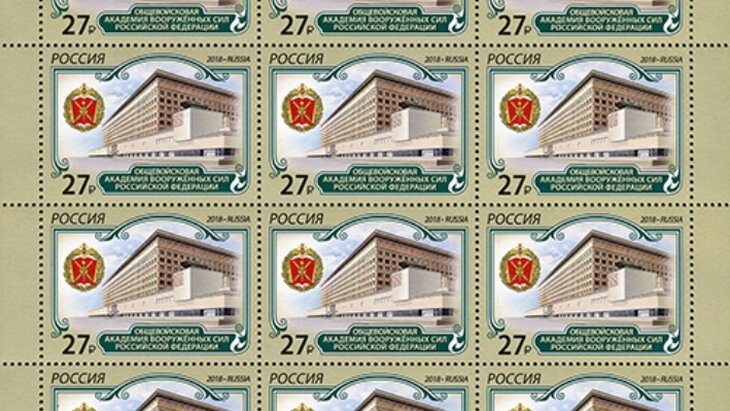 Отмечается, что на почтовой марке изображены здание и эмблема Общевойсковой академии ВС РФ.