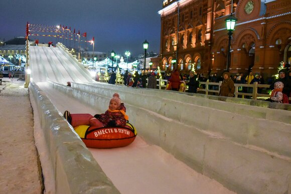 "На переходе от Манежной площади к площади Революции открылась полюбившаяся москвичам большая ледяная горка длиной 100 м. Всем желающим бесплатно выдают санки-ватрушки для катания", – рассказал мэр.