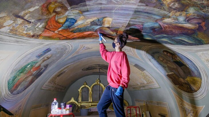 Стены Храма Воскресения Словущего на Успенском Вражке укрепили, а покрытие кровли заменили. Помимо этого, реставраторы укрепили лепной декор и обновили позолоту на крестах.