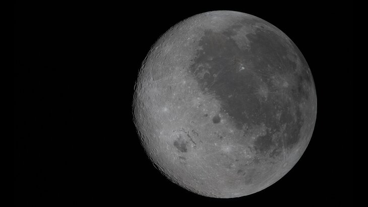 Справа на снимке можно увидеть привычную часть Луны с темными пятнами, а слева – скрытую половину.