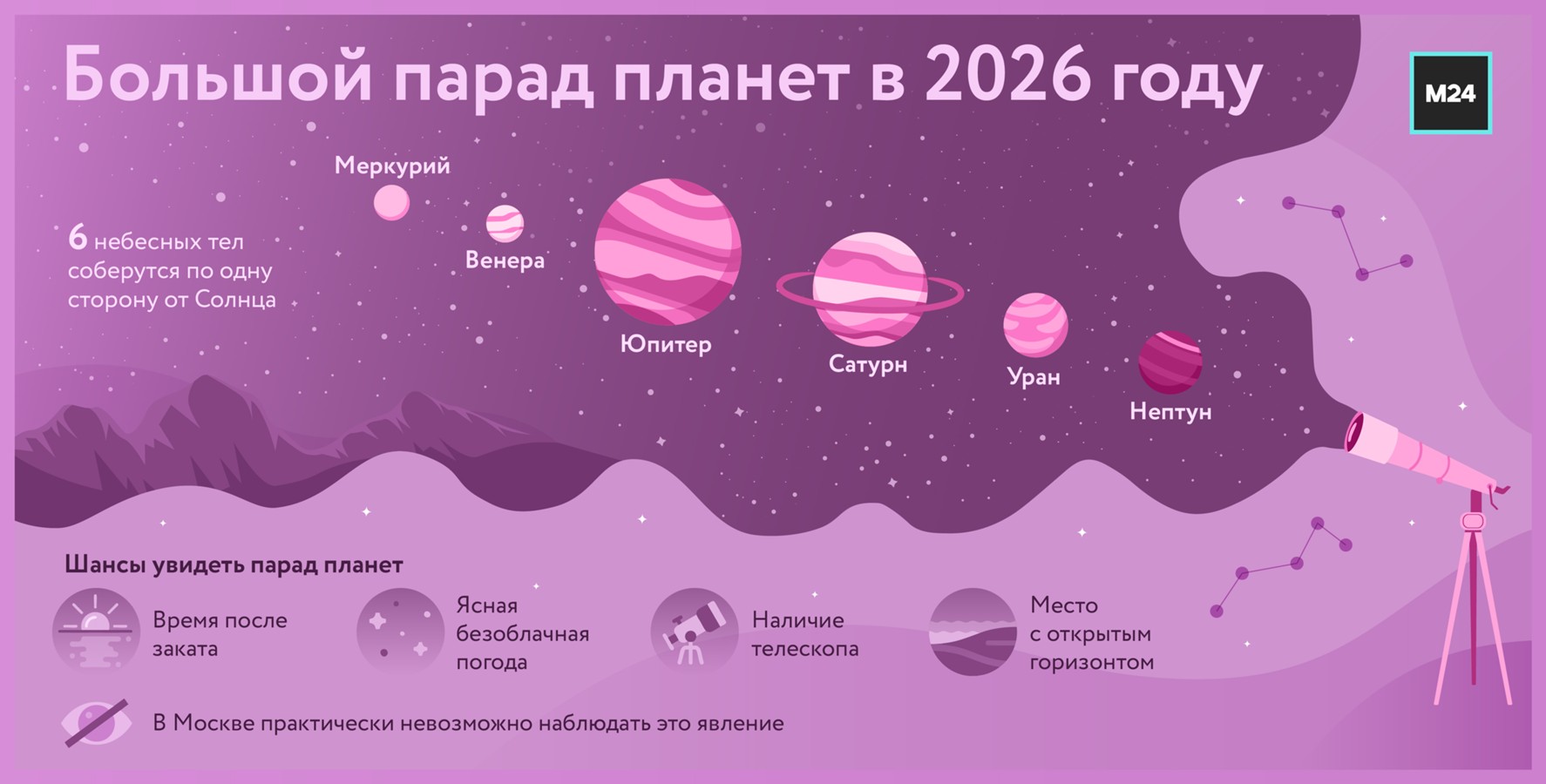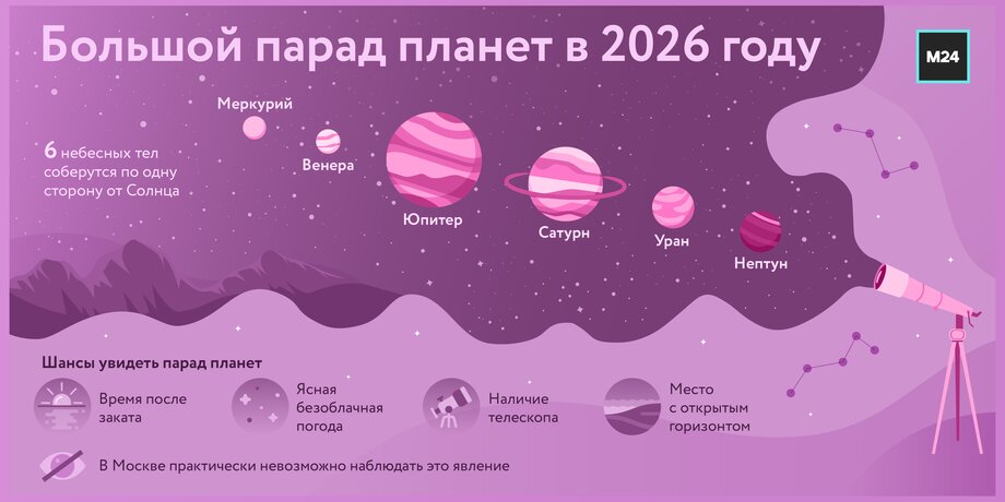 Большой парад планет, который состоится в ночь с 28 февраля на 1 марта 2026 года, будет практически невозможно увидеть в столице. Об этом Москве 24 рассказала научный директор Московского планетария Фаина Рублева.