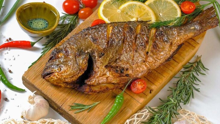 Те, кто предпочитает речную рыбу, могут выбрать карпа, приготовленного кусочками на шпажках. Его плотная кожа сохраняет форму даже после удаления чешуи, что важно во время жарки на открытом огне. Таким образом карп приобретает аппетитную золотистую корочку, оставаясь внутри нежным и слегка сладковатым.