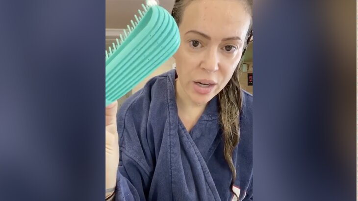 На видео Милано демонстрирует, что при каждом взмахе расческой у нее выпадают пучки волос.