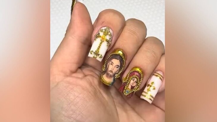 Ранее в Сети появилось видео с "пасхальным" маникюром, который оформлен в соответствии с религиозными канонами. На ногтях можно увидеть золотые кресты и изображения святых.