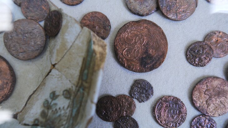 Археологи нашли и старинные медные монеты. Их относят к XVIII – началу XX века. Была обнаружена монета 1730 года, которую использовали во время правления Анны Иоанновны, другая монета 1800 года, когда правил Павел I, а третья приходится на 1903 год на время правления Николая II.