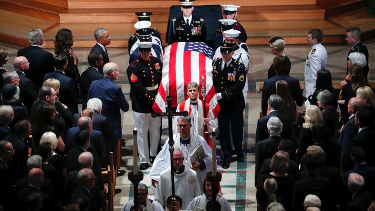 Джон Маккейн скончался 25 августа в возрасте 81 года от рака мозга. 31 августа гроб с телом сенатора выставили в центральной ротонде Капитолия, а 2 сентября его похоронили на территории Военно-морской академии в Аннаполисе.