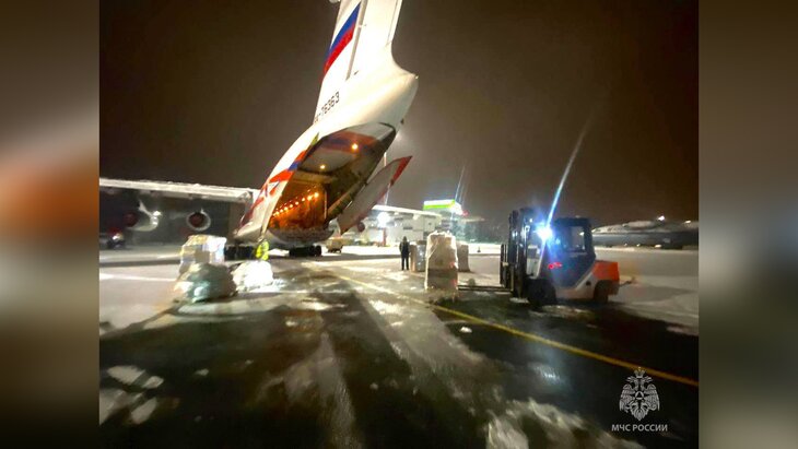 Как сообщили в МЧС России, на борту находится 15 тонн гуманитарного груза: продукты, включая детское питание, средства личной гигиены, постельное белье, пледы и спальные мешки.