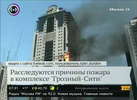 Московские эксперты помогают чеченским коллегам расследовать дело о пожаре в комплексе "Грозный-Сити". Установлено, что возгорание произошло из-за короткого замыкания.