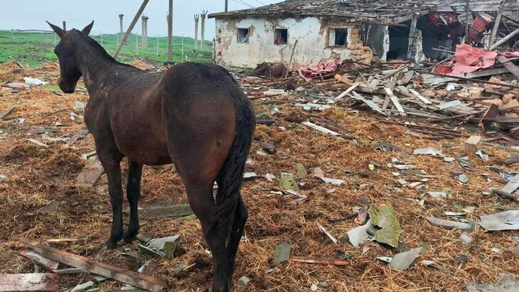 Согласно его публикации, не менее 10 БПЛА самолетного типа ударили по конной ферме в Акимовском муниципальном округе. После прямых попаданий начался крупный пожар, выжить удалось лишь трем животным.