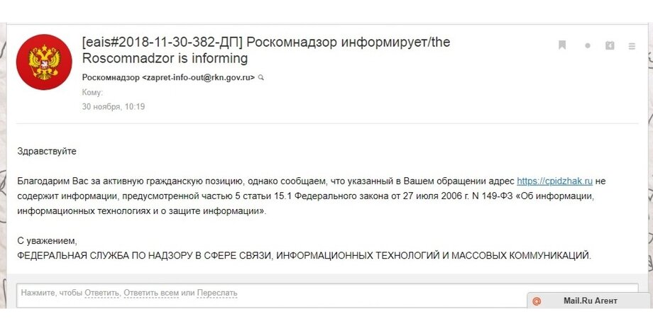 Согласно информации, размещенной на официальном сайте Роскомнадзора, ресурс cpidzhak.ru был внесен в Единый реестр запрещенной информации.