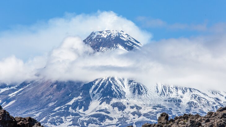 Спасателям приходится работать в сложных условиях. На высотах дует штормовой ветер, из-за которого накануне спасательный вертолет не смог сесть на вулкане.