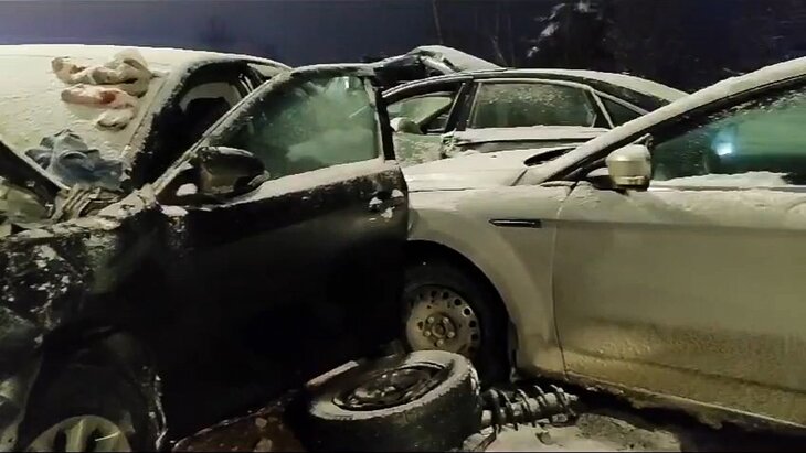 Машина потеряла управление и столкнулась с металлическим ограждением. По данным следствия, на задней оси автомобиля установлены покрышки, которые не соответствуют дорожным условиям. Это и могло стать причиной первой аварии.