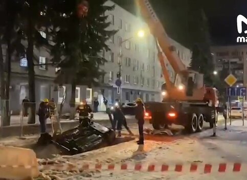 В результате падения в яму машина перевернулась на крышу. Водитель покинул салон самостоятельно, а транспортное средство доставали при помощи крана.