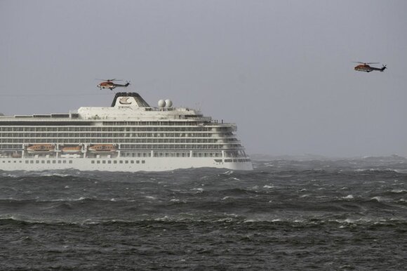 Лайнер стоит на якоре у западного побережья Норвегии, в районе происшествия сильный ветер, из-за чего спасательная операция может занять длительное время.