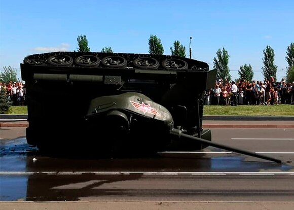 Танк Т-34 перевернулся при погрузке после военного парада в Курске