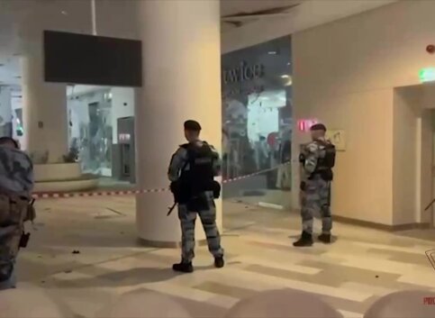 На кадрах виден разрушенный потолок и работающая сирена. Внутри самого ТЦ дежурят сотрудники Росгвардии, а место происшествия оцеплено.