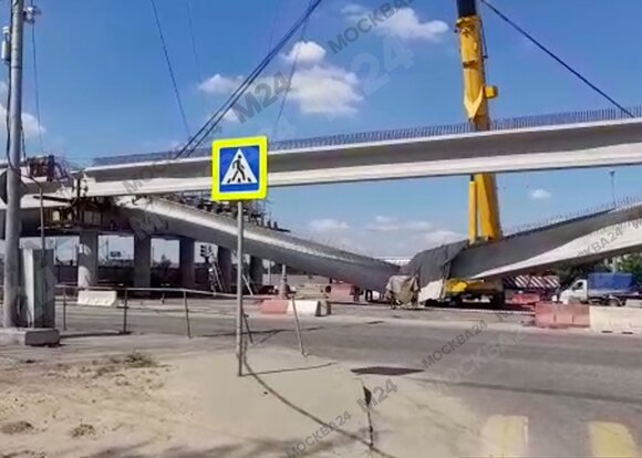 На Симферопольском шоссе обрушилась часть конструкции строящегося моста. Об этом сообщается в телеграм-канале Москвы 24.